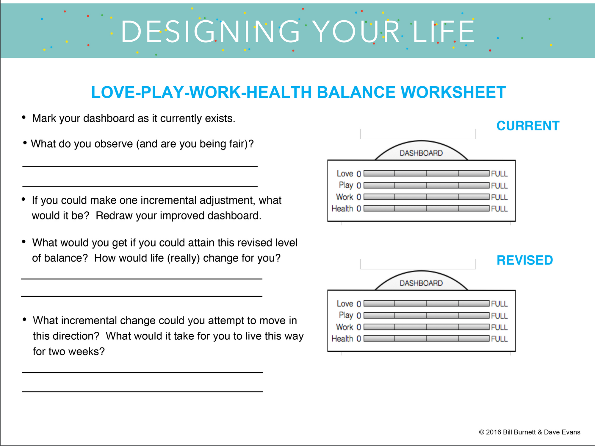 - Health/work/play/love gauge – if you didn't read the book, you can still have the worksheet on its website. It's interesting to see the 'play' category, as when I observed kids, that's what they do. When you're fully in the play mode, you're experiencing the flow - a mode deep in the human nature and bringing us fun.