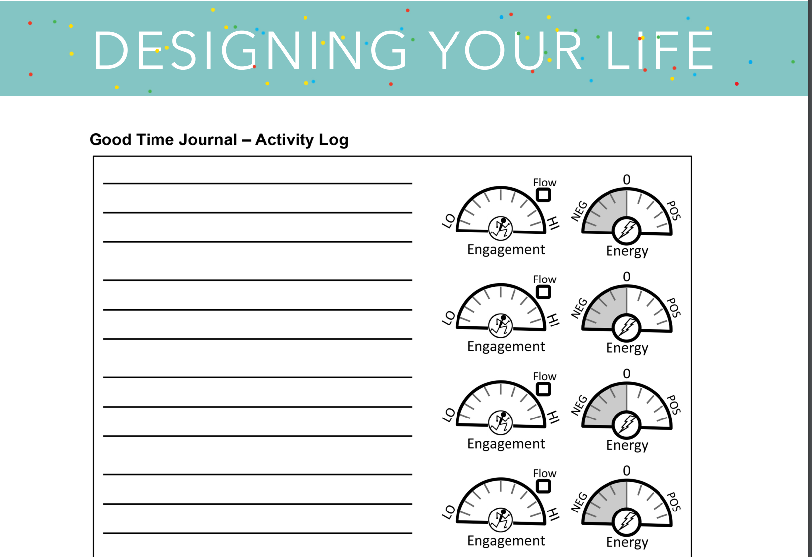 3. Then, it's the portion that a lot of book reviews highlighted -- the good time journal. Complete a log of your daily activists, using this worksheet provided. Try to do this daily, or at the very least every few days, and continue this for 3 days. So for every entry, try to measure the level of engagement, energy and whether there's a flow reached.